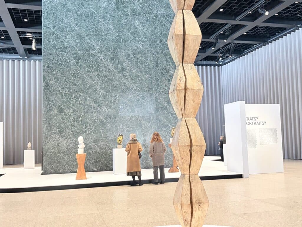 Brancusis organisch fließenden Objekte aus Alabaster oder goldener Bronze auf eher rauen Sockeln des Bildhauers sind ein gelungener Kontrast zu der geometrischen Strenge, dem Stahl und grünen Granit des Mies Van der Rohe Glastempels. Die Außenwelt ist dieses Mal durch graue Vorhänge vom Ausstellungsraum getrennt.